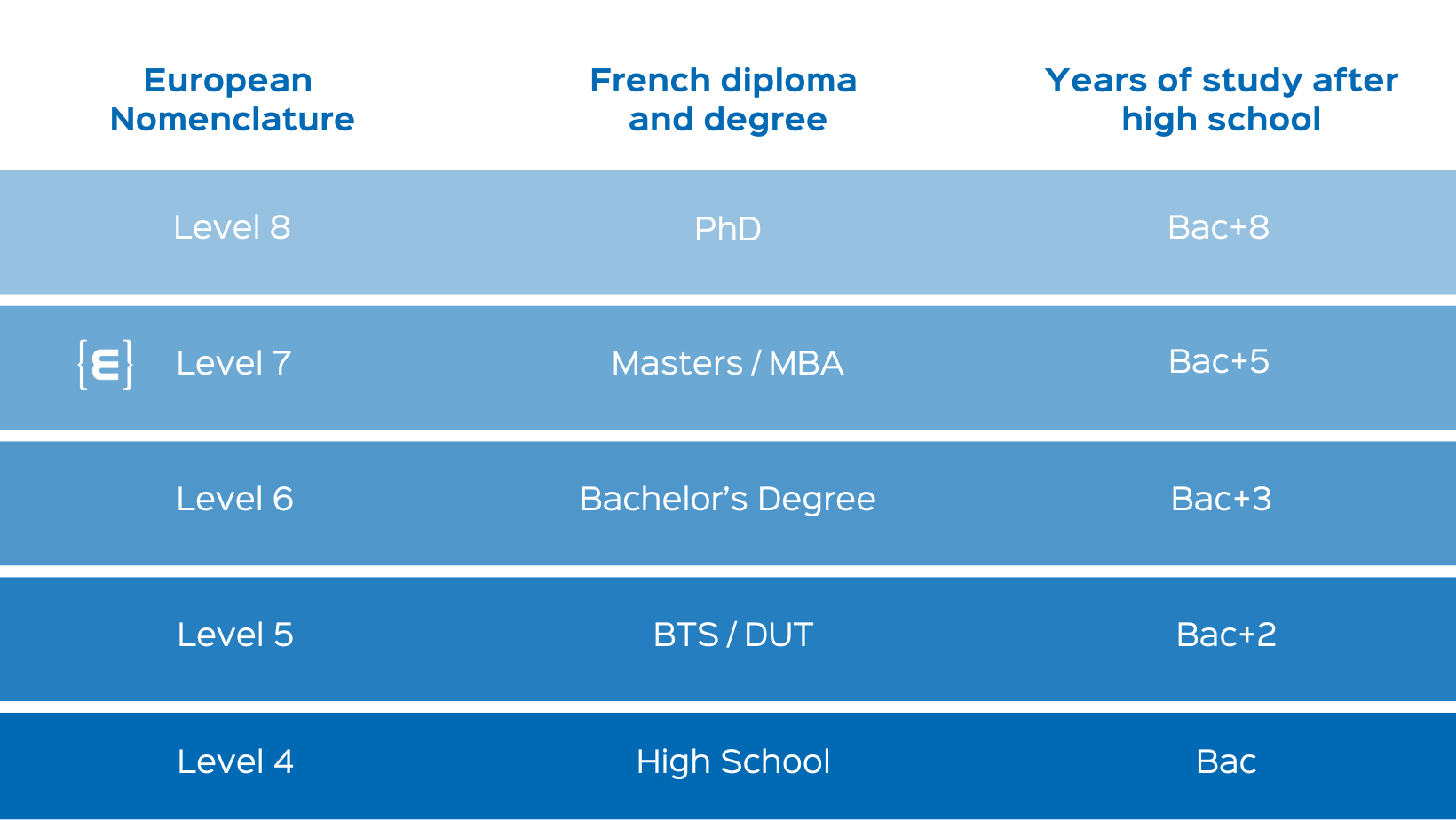 Below you can see a table showing the equivalence of higher education studies in France: