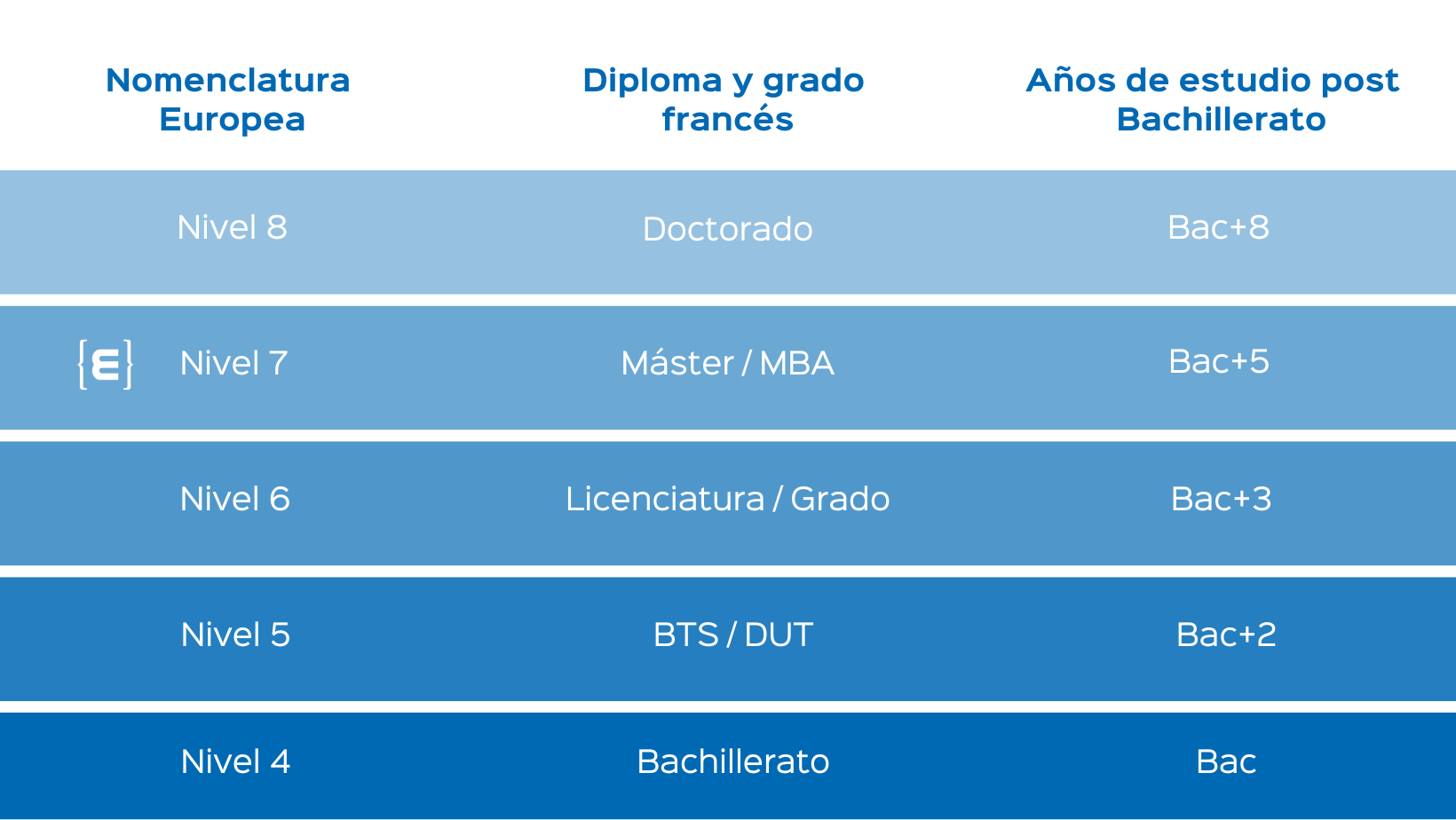 A continuación te mostramos la tabla de las equivalencias de los estudios superiores en Francia: